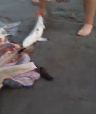 行きかう人の中で助けを申し出てくれる男性がいました。男性はナイフでサメのお腹を切り、3匹のサメの赤ちゃんを取り出し、海に返しました。