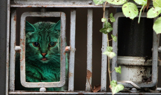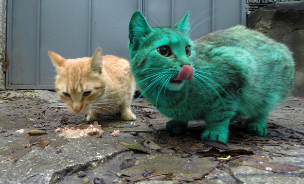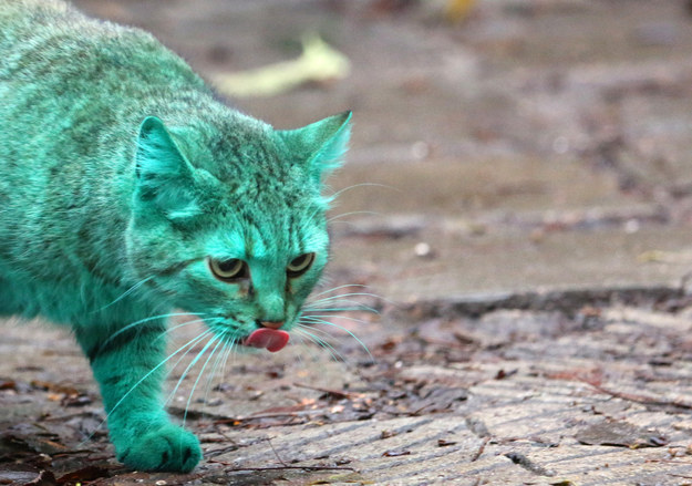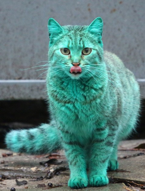 ブルガリアのヴァルナという街に現れたこのターコイズグリーンのねこさん。野良ねこのようで、誰かにイタズラや虐待されたわけでなく、ガレージにあった人口染料の上で何時間も眠った事が原因だったらしいのです。