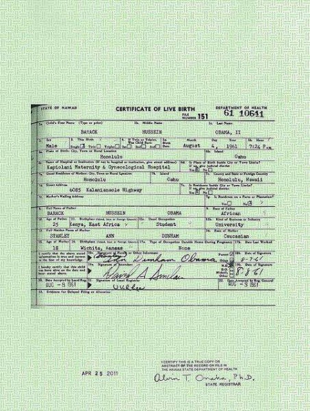 オバマ大統領はケニア生まれでハワイで生まれていないという陰謀説です。オバマ大統領はその陰謀説を払しょくするため出生証明書を公にしましたが、それは偽物だという説です。ちなみに大統領の条件として合衆国内での出生というのがあります。