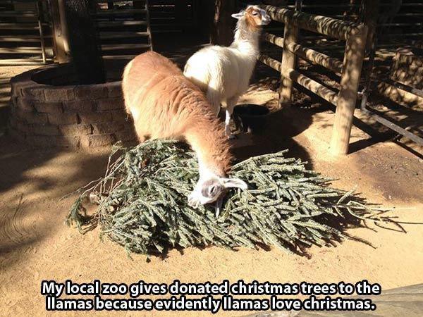 寄付された使い終わったクリスマスツリーをこの動物園ではラマに上げています。ラマはクリスマスが大好き。