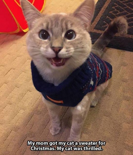 クリスマスに母さんが私のねこにセーターをくれた。ねこはスリルを感じているようだ。